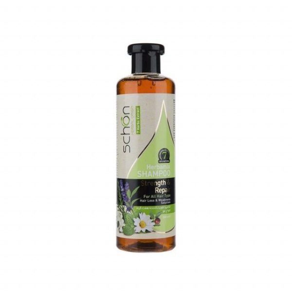 شامپو شون مدل Herbamix حاوی عصاره و خواص 7 گیاه مفید در طب سنتی بوده و در ترمیم، بازسازی، جلوگیری از ریزش موها و حفاظت پوست و موی سر کاربرد دارد.