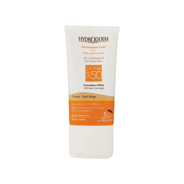 کرم ضد آفتاب رنگی هیدرودرم مدل Oil Free SPF50 محصولی کرم پودری از مراقبت پوست صورت و فاقد چربی بوده که برای پوست های چرب، مختلط و جوشدار فرموله شده است. این محصول با داشتن ساختار سیلیکونی، پوششی ابریشمی روی پوست ایجاد کرده و برای مدت طولانی از پوست در مقابل پرتوهای مضر نور خورشید محافظت می کند. همچنین، با تنظیم ترشح چربی پوست، از ایجاد جوش و آکنه جلوگیری می کند. فرمولاسیون ضد آب، مقاومت در برابر تعریق و شستشو و ماندگاری بالا از دیگر ویژگی های کرم ضد آفتاب هیدرودرم مدل Oil Free SPF50 است. این محصول دارای رنگ کرم پودری بژ صدفی بوده و به یکنواخت سازی چهره و پوشاندن ناهمواری های آن کمک می کند.