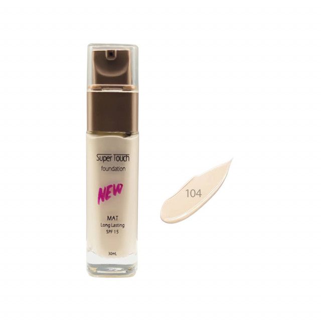 کرم پودر سوپر تاچ شماره 104 بافتی نرم دارد که به خوبی روی پوست پخش شده و سبب یکدست شدن رنگ آن و پوشش منافذ باز پوست، جوش، کک و مک و لک می شود. این کرم پودر صورت ماندگاری بالایی داشته و نمای مات، طبیعی و ابریشمی روی پوست ایجاد کرده و با SPF15 از پوست در برابر اشعه های مضر نور خورشید محافظت می کند. همچنین، با داشتن خواص آبرسانی، از خشکی، پوسته پوسته شدن و ترک پوست جلوگیری می کند. انواع پوست می توانند از کرم پودر سوپر تاچ برای آرایش پوست صورت خود استفاده کنند.