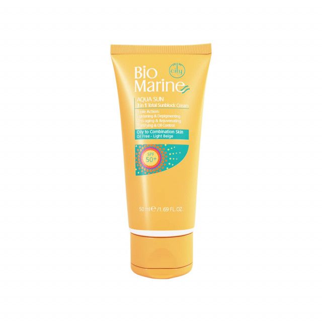 کرم ضد آفتاب بایومارین با داشتن SPF50 از پوست در برابر اشعه های ماوراء بنفش نور خورشید محافظت می کند. این کرم ضد آفتاب با بهره گیری از مواد حیات بخش و آرامش بخش با منشاء دریایی و فرمولاسیون فاقد چربی و همچنین عدم استفاده از روغن های جوش زا، پوست صورت را مات خواهد کرد. عملکرد این محصول به گونه ایست که علاوه بر محو تدریجی لک ها از بروز مجدد آن ها جلوگیری کرده و رنگ پوست را بهبود بخشیده و روشن می کند. همچنین، به رفع چروک های ناشی از تابش های مضر نور خورشید و افزایش سن کمک می کند. عصاره های خزه دریایی و کلاژن هیدرولیز شده موجود در این محصول رطوبت و نرمی پوست را تأمین می کند. ضد آفتاب بایومارین پوست چرب با داشتن رنگ بژ روشن و ایجاد لایه ای یکنواخت و هماهنگ با رنگ طبیعی پوست، شما را از زدن کرم پودر بی نیاز می کند.