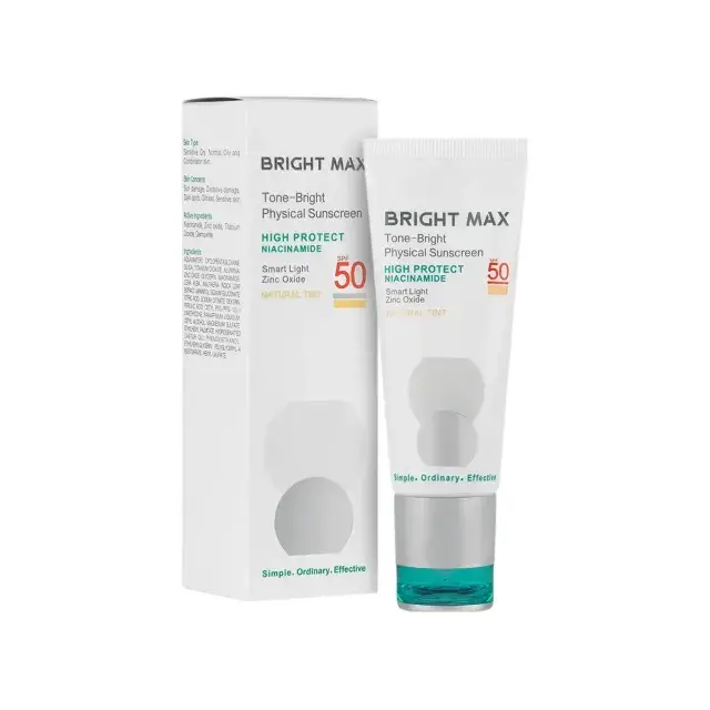 ضد آفتاب برایت مکس رنگی مناسب انواع پوست به خصوص پوست های حساس و دارای اگزما است. این کرم ضد آفتاب دارای بافت سبک با رنگ طبیعی بوده که به واسطه نیاسینامید و زینک، ضمن روشن کردن پوست، ظاهری مات به آن می بخشد. این محصول با دارا بودن SPF 50، از پوست در برابر اشعه های مضر نور خورشید محافظت می کند. همچنین با کوچک تر کردن منافذ پوست، ترشح چربی آن را کنترل کرده و ظاهری مات به پوست می دهد.