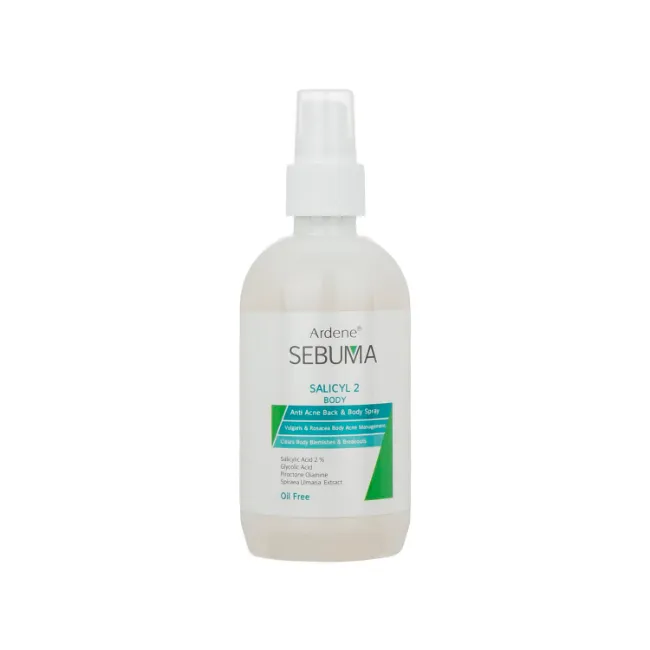 این ضد جوش بدن با فرمولاسیون بدون چربی، برای رفع و جلوگیری از بروز مجدد جوش بر روی بدن، از جمله سینه، بازو، شانه، پشت و گردن طراحی شده است. خرید اسپری ضد جوش آردن مدل Salicyl2 ضد التهاب و استفاده از آن، کمک می کند تا جوش های التهابی ملایم و کومدون های سر سیاه و سر سفید کاهش یافته و قرمزی و التهاب پوست نیز التیام یابد. این اسپری حاوی اسید سالیسیلک 2%، اسید گلیکولیک، پیروکتون اولامین، نیاسین آمید و عصاره های گیاهان لیکوریس و چای سبز است.