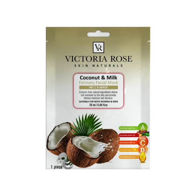 ماسک صورت نقابی شیر و نارگیل ویکتوریا رز دارای ویژگی های حاوی عصاره شیر و نارگیل، مناسب انواع پوست، آبرسان و مرطوب کننده، روشن کننده پوست می باشد.