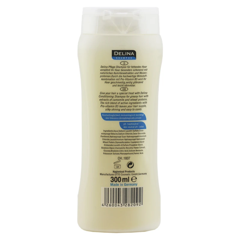 شامپو مو دلینا مناسب موهای چرب حجم 300 میلی لیتر دارای ویژگی های پاک کننده کامل انواع آلودگی از مو، کنترل کننده میزان چربی پوست سر و موها، حاوی عصاره بابونه با اثر ضدالتهاب بر پوست سر می باشد.