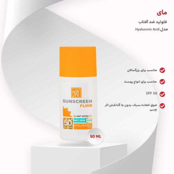 ضد آفتاب فلوییدی مای با SPF50 محصولی مناسب برای انواع پوست است که به خوبی از آن در برابر اشعه‌های مضر آفتاب (UVA و UVB) محافظت می‌کند. تکنولوژی Wet Skin استفاده شده در ساخت این محصول باعث شده است تا شما بتوانید از این ضد آفتاب هم روی پوست خشک و هم روی پوست مرطوب استفاده کنید. این ضد آفتاب بر پایه آب ساخته شده است و به همین دلیل پس از استفاده احساس سنگینی یا چربی روی پوست ایجاد نمی‌کند. محصولات مای کیفیت بسیار خوبی دارد و قابل استفاده به صورت روزانه است.