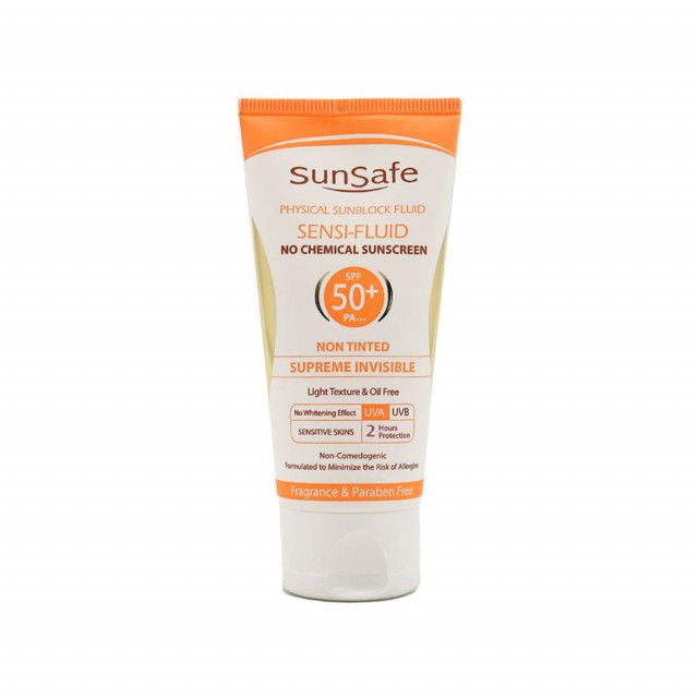 فلوئید ضد آفتاب فیزیکال سان سیف SPF 50 حاوی فیلترهای فیزیکی و نانوتیتانیوم دی اکسید بوده و با فرمولاسیون ویژه بر پایه آب و بافت سبک برای پوست های حساس و مستعد قرمزی فرموله شده است. این محصول فاقد جاذب های شیمیایی، چربی، اسانس، پارابن و رنگ بوده و میزان ترشح غدد چربی پوست را تنظیم کرده و با خاصیت ضد التهابی از ایجاد حساسیت، جوش و آکنه جلوگیری می کند.